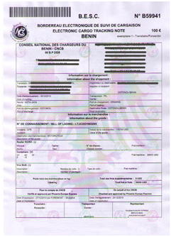 根据贝宁国法令,凡发货至贝宁科托努 (COTONOU) 港或经由此港转往其他目的地的货物都必须申请电子货物跟踪单BESC,BESC全称为:BORDEREAU DE SUIVI DE CARGAISON。