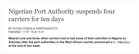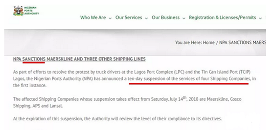 尼日利亚港务局(NPA)在一份新闻稿中表示,从当地时间7月14日开始,尼日利亚所有港口将暂停对马士基,中远海运,APS和Lansal四家航运公司提供港口服务,为期10天!
